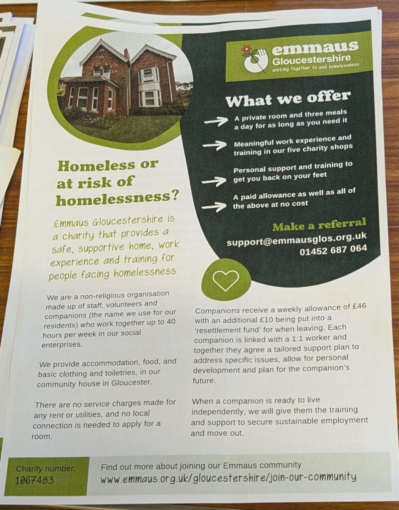 Lorraine and Kirstin gave us an excellent talk in November about the Emmaus organisation. Emmaus does much more than just fund-raising for homelessness. Emmaus is an international organization. It is a social enterprise that supports homeless people by offering them accommodation (Emmaus Gloucestershire has a 26-bed house in Gloucester) and giving them a sense of purpose, training and skills. It helps them find a way back into employment and eventually back into independent living, where possible. Emmaus Gloucestershire has two shops in Nailsworth and shops in Gloucester, Stroud and Cheltenham.